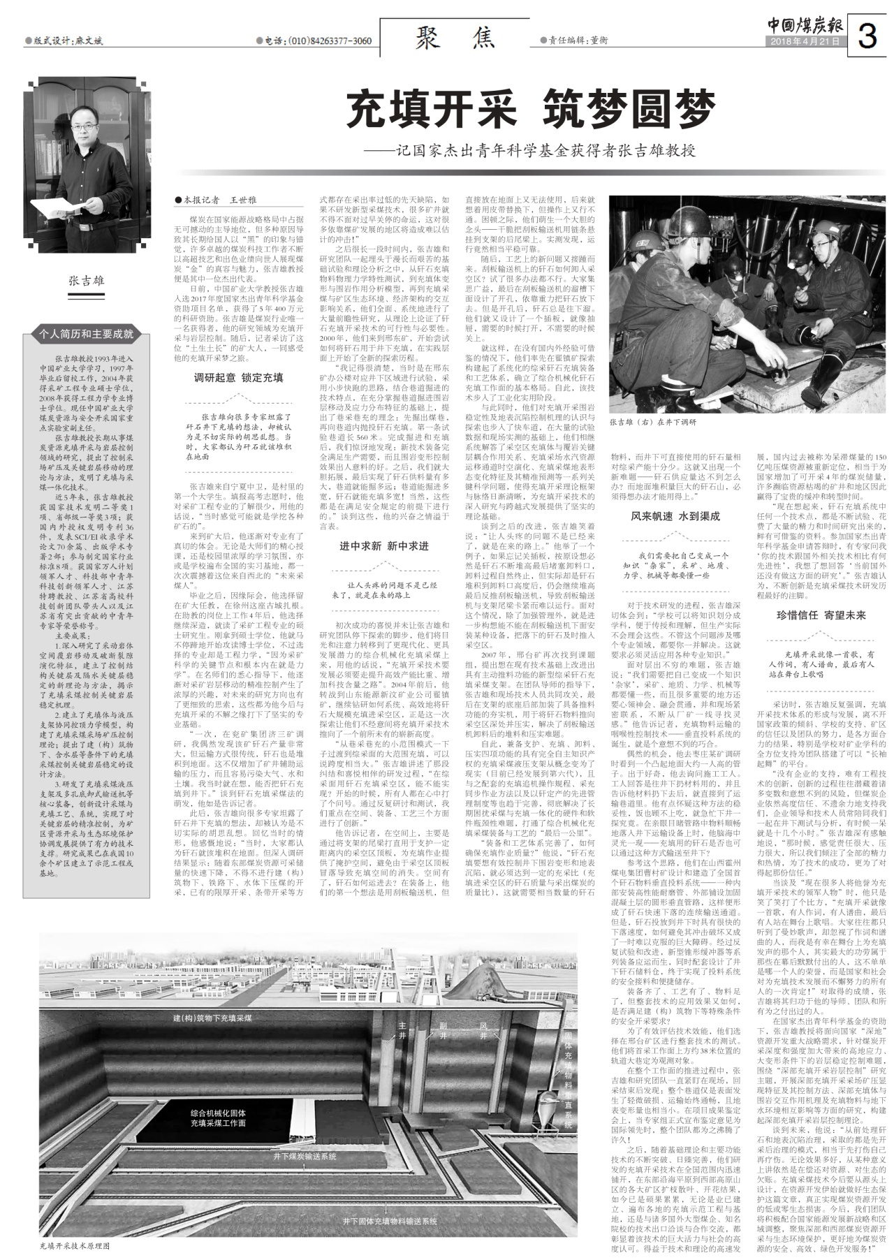 《中国煤炭报》2018年4月21日第3版以“充填开采 筑梦圆梦——记国家杰出青年科学基金获得者张吉雄教授”为题报道了张吉雄教授先进事迹,原文如下: