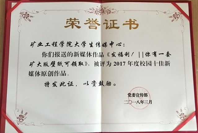 随着新媒体平台的持续发展,优秀的网络文化作品层出不穷,矿业学院高度重视宣传工作尤其是新媒体工作,新媒体工作室在学院党委正确领导下,部门成员团结奋斗,圆满完成了2017年度的工作任务。“阳光矿院”微信平台以“展学子学院之风采,扬拼搏向上之正气”为工作目标,树立“同步、精准、导向、创新”的工作理念,紧随新时代、新形势、新目标,引领学院文化发展、坚守网络舆论阵地、弘扬社会主义核心价值观、传播社会正能量。“阳光矿院”微信公众平台所创作的网络作品《发福利!//你有一套矿大版壁纸可领取》被成功评为校园新媒体十佳原创作品。