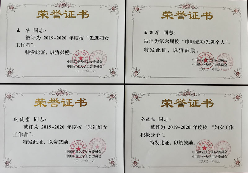 妇委会获“先进基层妇委会”荣誉称号,王华、赵俊芳2人获“先进妇女工作者”荣誉称号,金晓红获“妇女工作积极分子”荣誉称号。王丽华获“巾帼建功”先进个人。曹薇家庭获“爱心家庭”荣誉称号,侯世松家庭获“书香家庭”荣誉称号。董亚男同学获“十佳女大学生”荣誉称号,侯路遥同学获“优秀女学生干部”荣誉称号。