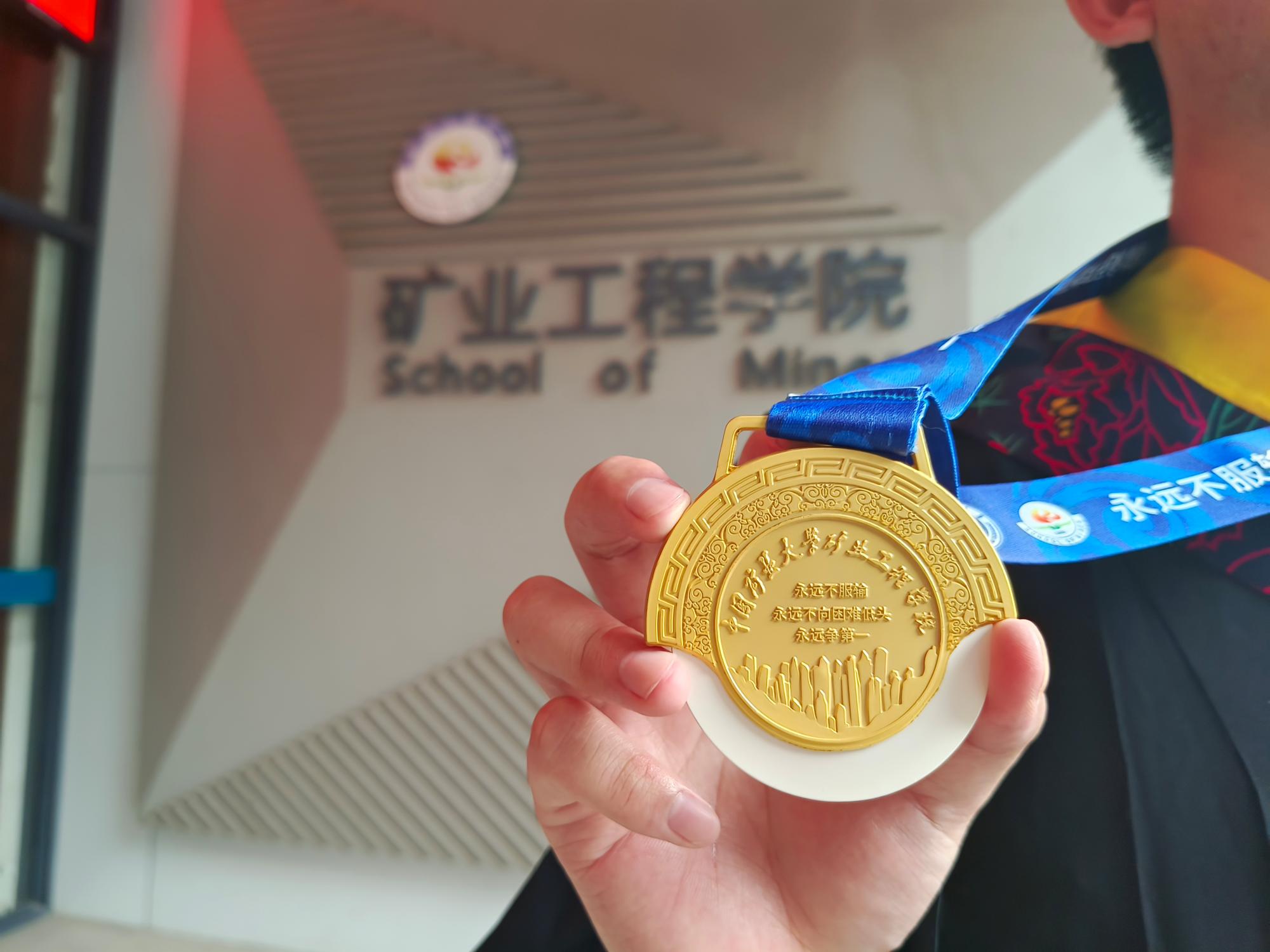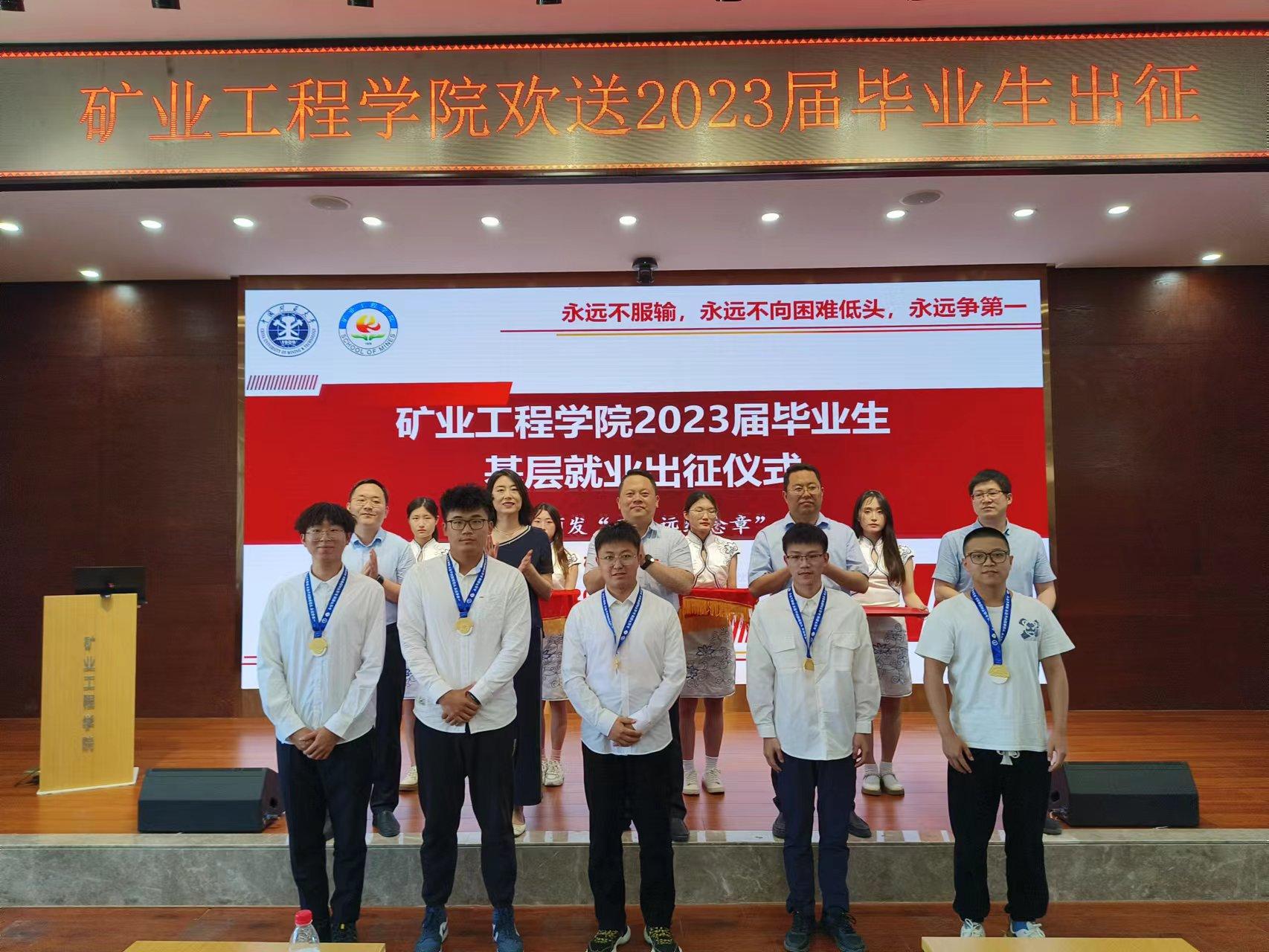 在出征仪式上,学院为2023届基层就业毕业生代表颁发“三永远纪念章”。学院一直坚持“学煤爱煤”主题教育,鼓励学生到矿山基层一线建功立业,截至目前,已经有132名毕业生签约煤炭行业。该纪念章整体造型为时光年轮,祥云点缀,寓意此去繁华似锦,归来仍是少年;正面为学校地标建筑图书馆和镜湖,叮嘱毕业生铭记母校和师长教诲,在青春赛道上奋力奔跑;背面为山峰造型,取意“世上无难事 只要肯登攀”,祝愿毕业生在“三永远”精神伴随下铸就精彩人生。
