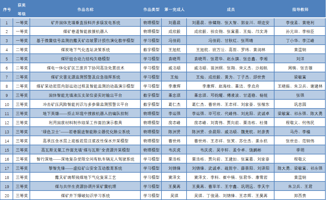 共20件作品获奖,其中李俊孟副教授指导的《矿井固体充填垂直投料井多级发电系统》、孙元田副教授指导的《煤矿巷道智能救援机器人》和丁小华副教授指导的《基于微震信号监测的露天矿边坡累计损伤演化教学模型》等3个作品获得一等奖,5件作品获得二等奖,12件作品获得三等奖。
