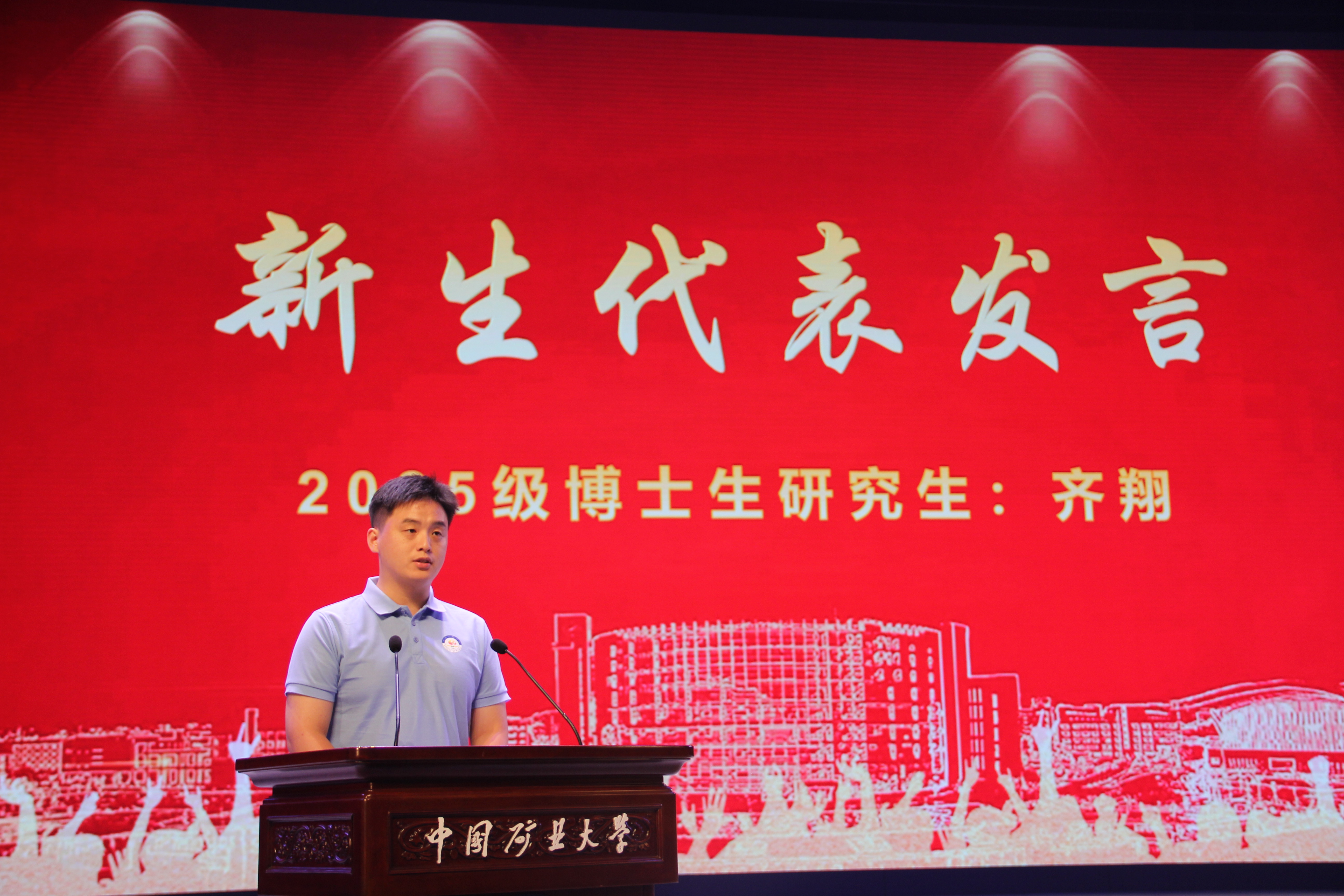 在校学生代表采矿工程2023级学生邢家瑜分享了从学业迷茫到专业拔尖的成长历程,寄语学弟学妹以“自强不息、艰苦奋斗、明德砺行”的精神,在矿大校园绽放青春光彩。新生代表采矿工程博士研究生齐翔分享自己求学选择的故事,表示将在矿山一线将“三永远”精神内化于心、外化于行,立志“扎根矿业、科技报国”。