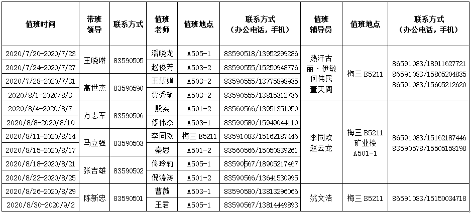 值班时间 | 值班人员 | 办公室电话 | 手机 | 值班室 |