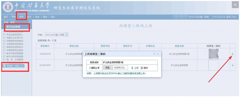 相关课程任课教师在雨课堂平台注册开课后,应按要求将相关课程班级的二维码发布到研究生院培养管理信息系统中,供学生扫描加入。二维码上传方法:以教师身份登录yjsxt.51eatgw.com,点击“教学-教学信息管理-雨课堂二维码上传”,选择列表中对应的开课班级行尾的上传图标。