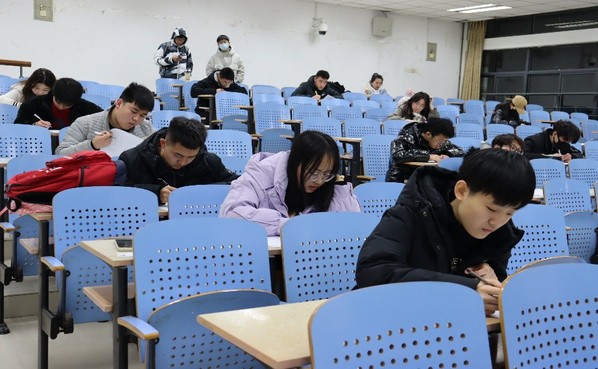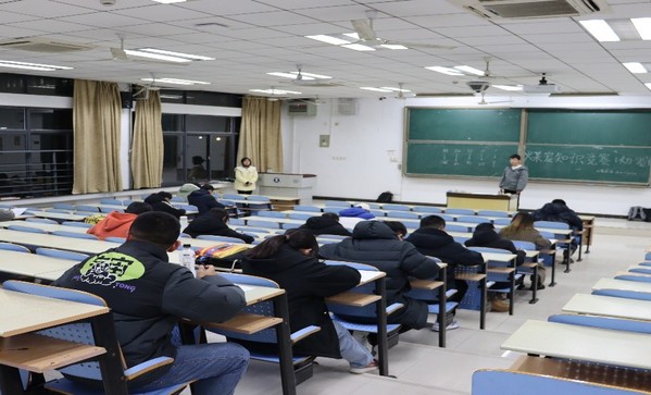 初赛以笔试的方式进行。考试开始前,监考人员到达相应教室,组织同学们签到就坐,并说明考场细则。受疫情影响,参考人员拉开距离,隔空就坐。考试期间,同学们严格遵守考场纪律,上交手机和书包,认真做答,通过自己备考所学将问题逐个击破。监考人员各司其职,巡视考察,维持考场纪律。考试结束,同学们有序交卷离开考场,监考人员整理试卷并打扫考场。