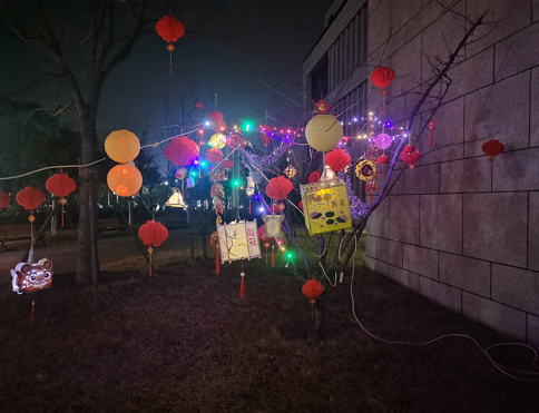 经过前期的精心准备,灯展所许需的花灯及装饰物都已安排完毕。下午两时,提案工作委员会全体成员于梅三集合,经过简单细致的工作分配,成员们前往力行楼指定地点进行布置。随后,成员们按照各自的分工展开装饰,三人进行灯笼的布置,另外四人进行灯光及装饰物的布置。成员们都积极参与其中,并且细心地进行布置,努力将灯展做得更加漂亮。布置完成之后,成员们来来回回检查好几遍,确定布置完美后才离开。下午五时,成员们来力行楼花灯现场开启灯光,展览开始!绚丽的灯光在夜间闪烁,为热闹的夜晚增添了一份喜悦的气氛。前来观赏的同学们都表示灯光非常漂亮,并纷纷在闪耀的灯光中拍照留念。展览一直持续到22时,之后提案工作委员会成员开始陆续撤下花灯,进行最后的工作。