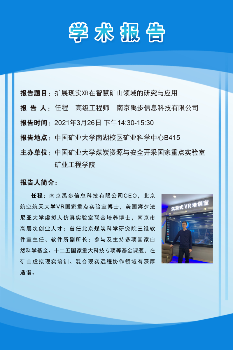 学术会议 主页 - 学科动态 - 学术会议 - 正文 学科报告:扩展现实XR在智慧矿山领域的研究与应用 作者:董成亮浏览:时间:2021-03-25 新闻来源:煤炭资源与安全开采国家重点实验室 摄影: 责任编辑: 审核: