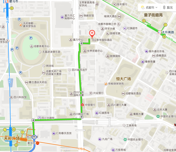 1、乘坐地铁2号线到达天府广场站F口下车,步行1.1公里(约15分钟)可到达目的地。